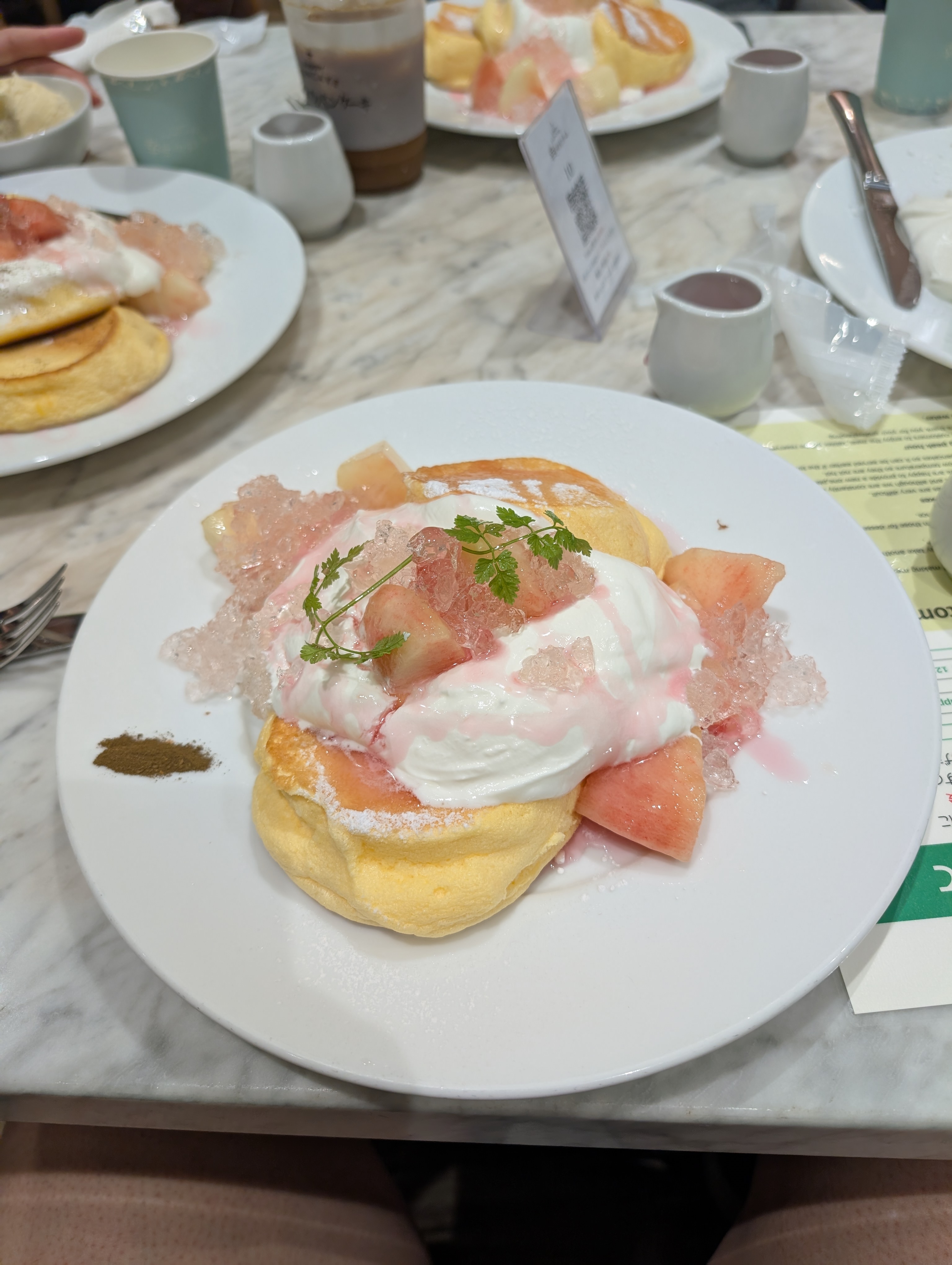 Photo Day 2 Japanese Fluffy pancakes are delicious and we happened to eat some. It has fresh peaches and jelly. So delicious.