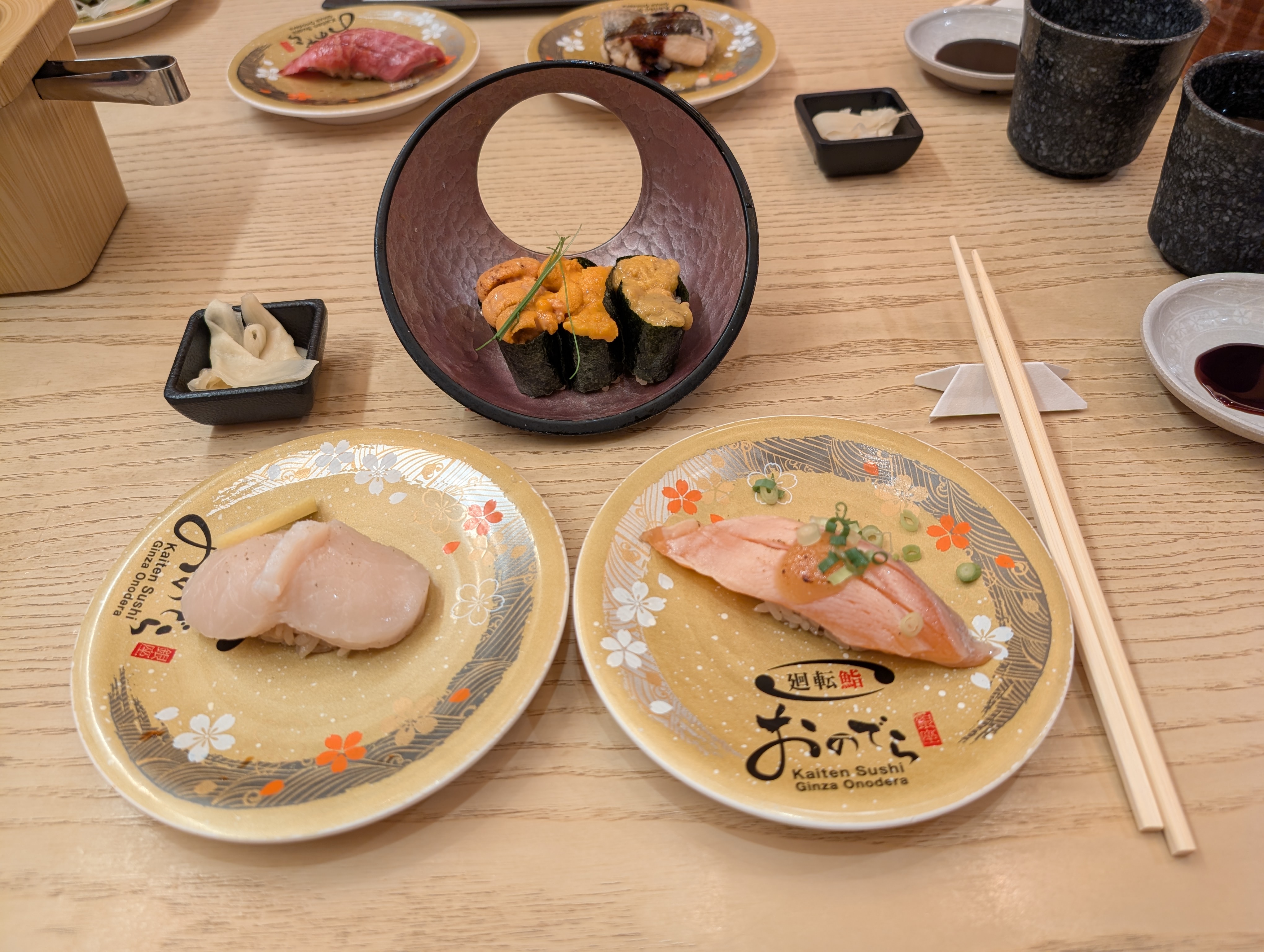 So I do love sushi and this was quite an experience. Kaiten (conveyor belt) sushi but michelin grade. We were there before it opened at 10 am (9:30 am) and we were still number 5 on the waitlist. I've never had 3 different types of Uni (sea urchin) purple, green, and orange. Delicious. Scallop, Salmon, and a O-Toro in the background.