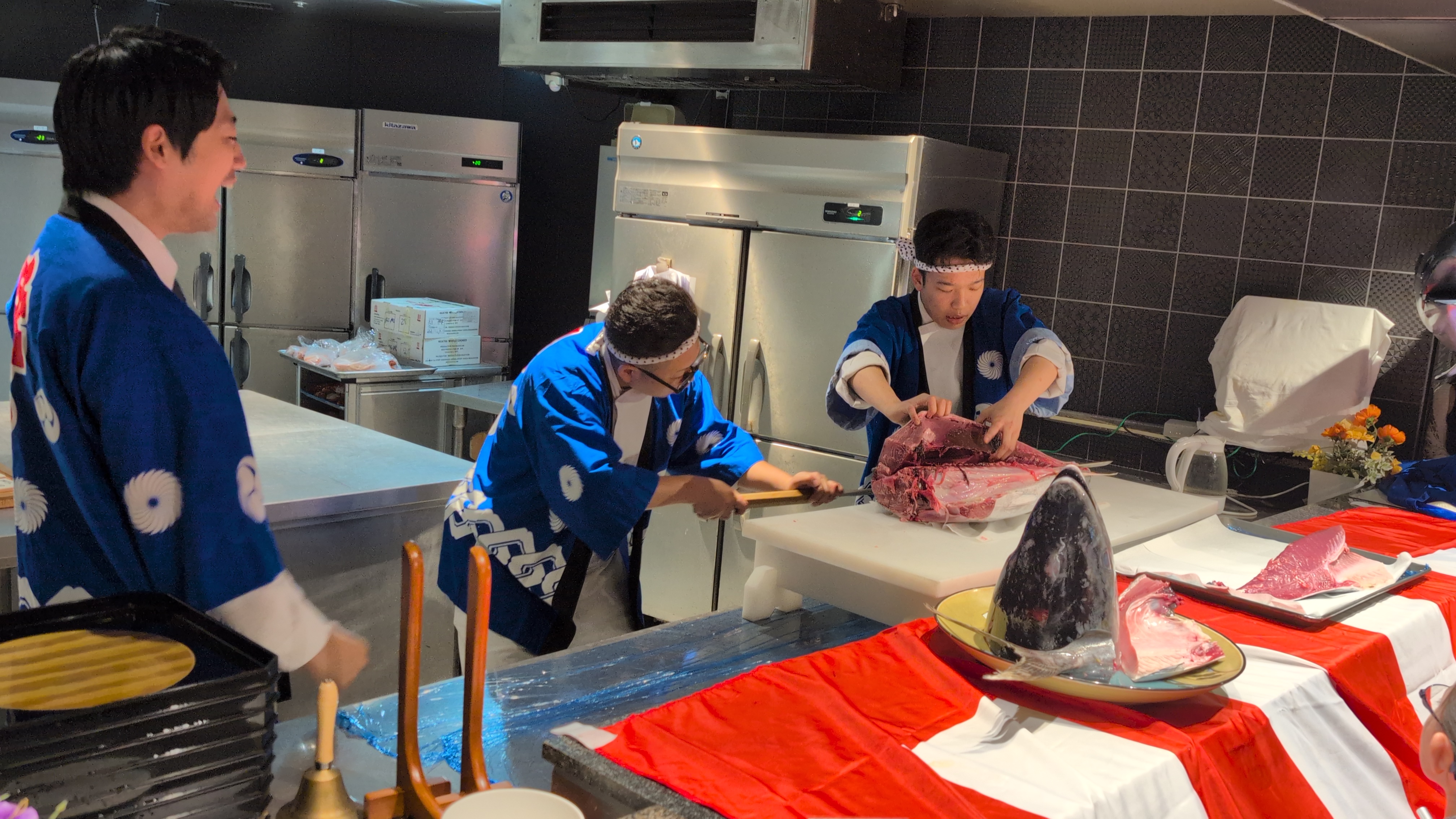 next we had dinner at the Ryokan (traditional Japanese Hotel with onsen) and it included a dinner buffet. Truly traditional ryokan you eat in room a Kaiseki (multi mini course meal) Dinner. I wasn't feeling it and DH preferred western beds not Tatami mats (sleeping on bedrolls on floor). So we choose a more modern and westernized Ryokan. That mean a bigger place with a buffet instead of a home cooked meal. But the buffet included a quick 10 minute show of cutting the Maguro (bluefin tuna) at least 100 lbs if not more! I've never actually seen a professional cutting. Yes I'm from hawaii and yes I've seen friends and family cut fish all the time. But this was insane! Look at the size of the head.