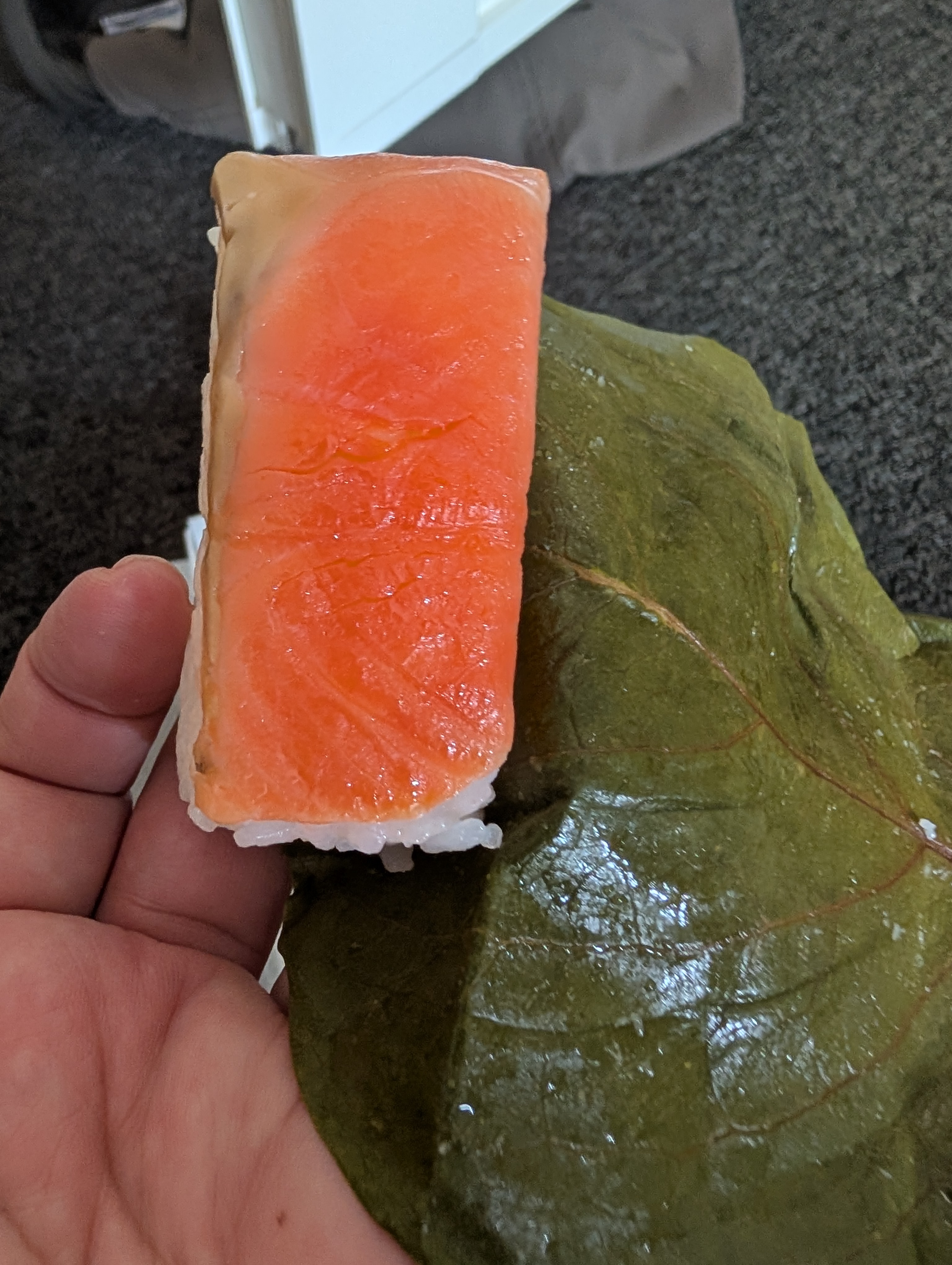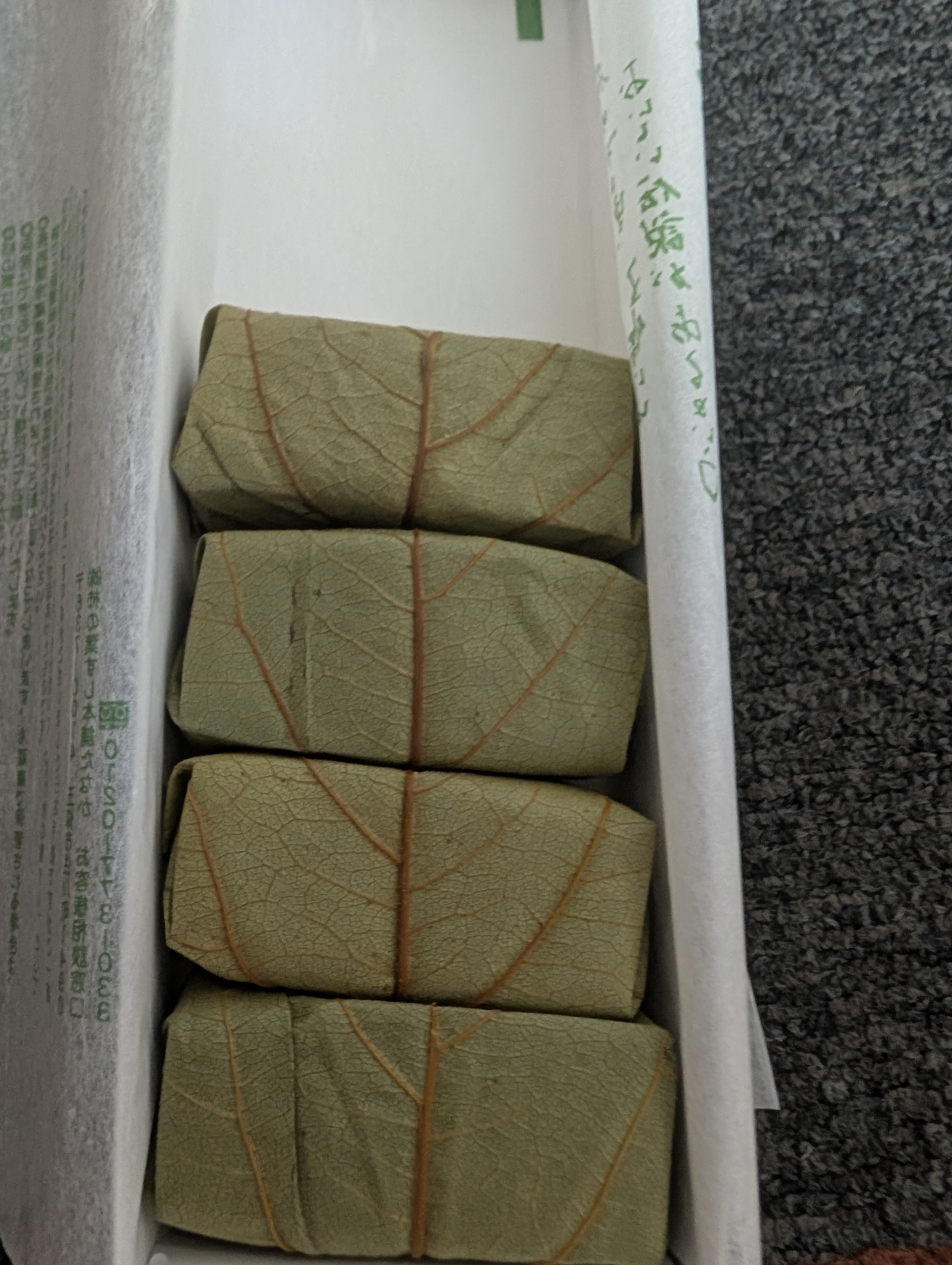 this is a specific type of sushi from the Kansai Region. it's sushi preserved in a persimmon leaf. Delicious.